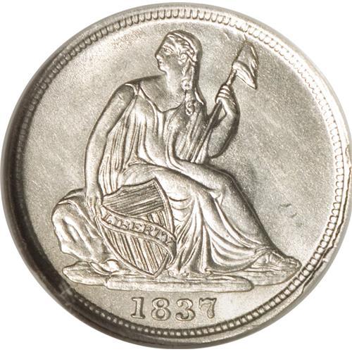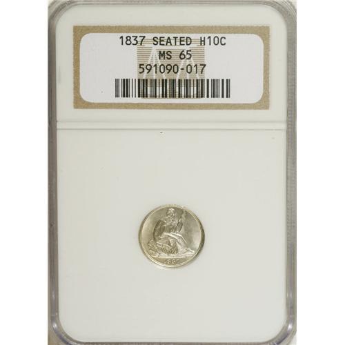<B>1837 H10C Small Date (Flat Top 1) MS65 NGC.</B></I> The "Small Date" has a thick flat flag on the 1 in the date. Well struck and untoned, with clean surfaces that have a pleasing satiny sheen across both sides. The reverse is rotated clockwise from the obverse by about twenty degrees. Slight bulging (as struck) is noted beneath Liberty's elbow, and faint die clash marks are seen extending downward from beneath the letter S into the upper reverse field, between the uppermost wreath leaves.<BR><BR><b>Shipping:</b> Coins & Currency (<a target="_blank" href="http://www.heritageauctions.com/common/shipping.php">view shipping information</a>)