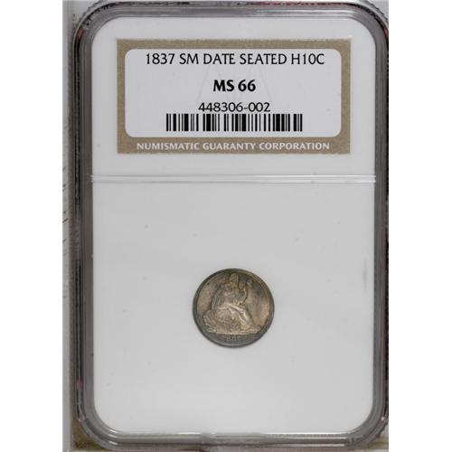 <B>1837<H10C> Small Date (Flat Top 1) MS66 NGC.</B></I> A splendid coin, and considered much scarcer than the Large Date variety. The surfaces display turquoise-blue, amber, and rose-gray coloration that attests to the originality of this lovely Premium Gem. A couple of minor luster grazes and pinscratches are noted in the obverse fields that preclude an even loftier grade assessment. The boldly impressed devices do full justice to Christian Gobrecht's original Liberty Seated design.