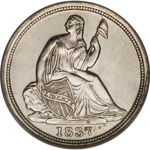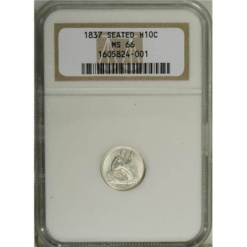 <B>1837 H10C Small Date (Flat Top 1) MS66 NGC.</B></I> Well struck except for the A in HALF. The surfaces are uncommonly well preserved and display an untoned sheen. A bright, premium quality Gem for the high grade type collector. There is an interesting die break (as struck) from the reverse rim at the first A in AMERICA.<BR><BR><b>Shipping:</b> Coin/Currency (<a target="_blank" href="http://www.heritageauctions.com/common/shipping.php">view shipping information</a>)