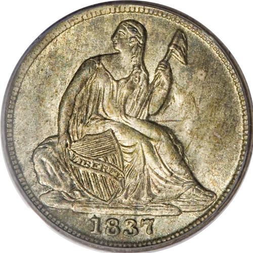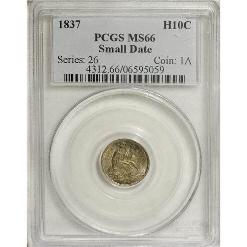 <B>1837 H10C Small Date (Flat Top 1) MS66 PCGS.</B></I> Blended apple-green and tawny-gold grace this satiny and nearly pristine Premium Gem. The strike is exacting save for slight softness on the left side denticles. A high grade representative of the ephemeral No Stars type. Population: 7 in 66, 4 finer (2/07).<BR><BR><b>Shipping:</b> Coins & Currency (<a target="_blank" href="http://www.heritageauctions.com/common/shipping.php">view shipping information</a>)