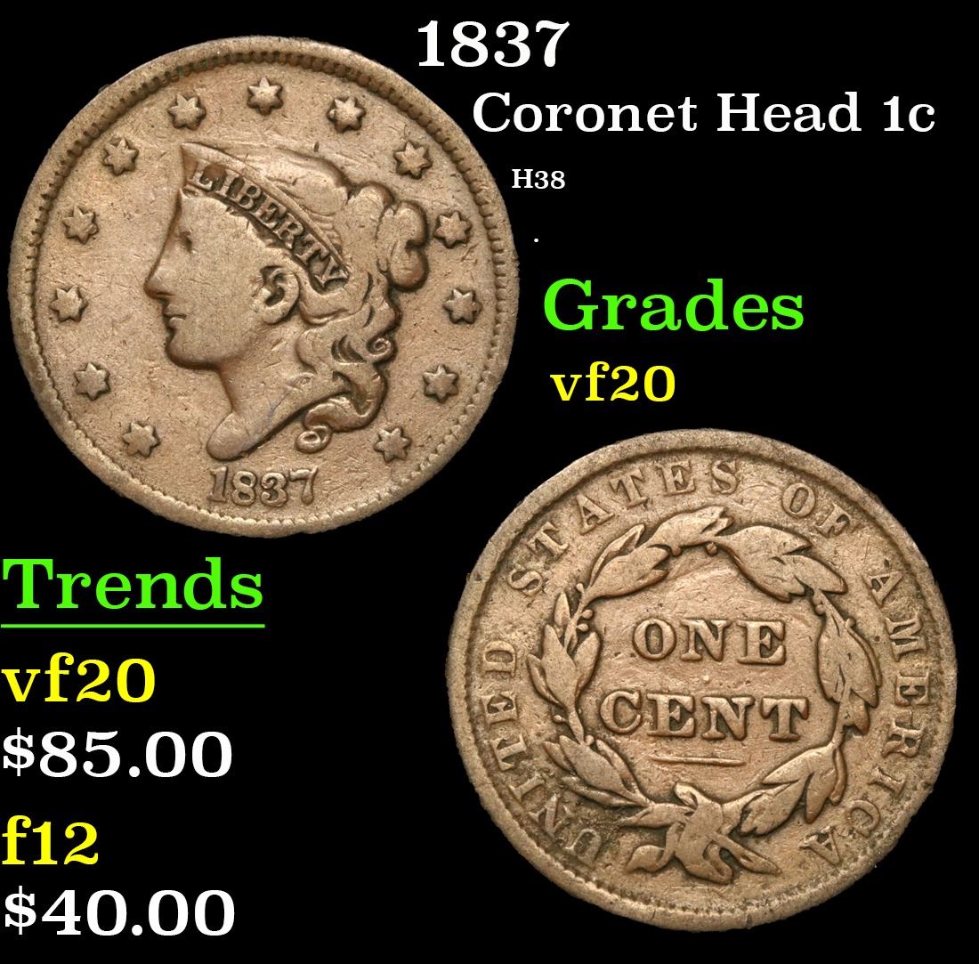 1837 H38 . Coronet Head Large Cent 1c Grades vf, very fine.
