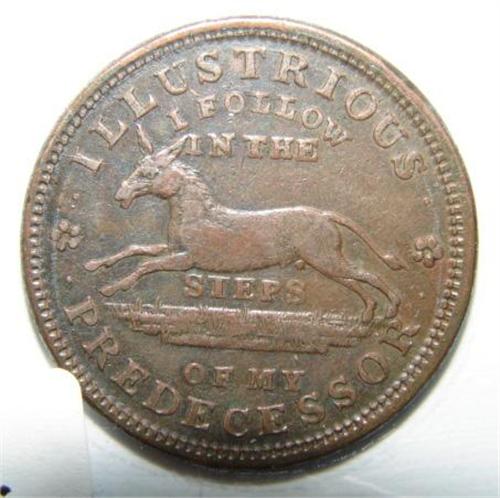 1837 U.S. HARD TIMES TOKEN. Front is marked “I follow in the steps of my/Illustrious/Predecessor” with a profile of a donkey. Reverse is marked “Executive/Experiment” with a profile of a turtle. XF.