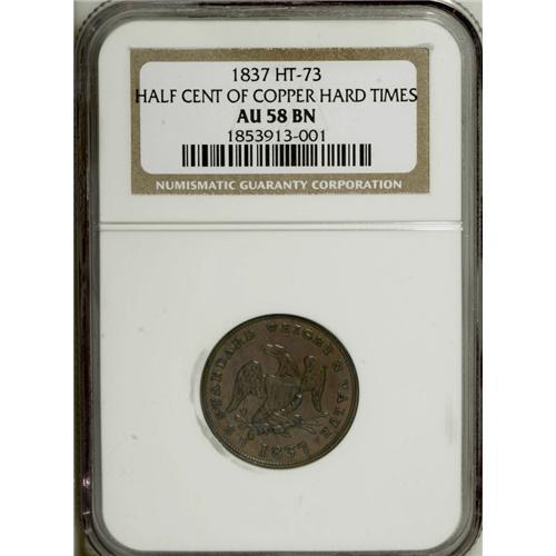 <B>1837 Half Cent Token AU58 NGC.</B></I> Low-49, HT-73. This piece is the only half cent denomination among all Hard Times tokens, and is often collected alongside regular U.S. Mint half cents. It is even listed in the half cent section of the <I>Guide Book.</B></I> Pleasing medium-olive color with splashes of darker steel and lighter tan.<BR><BR><b>Shipping:</b> Coins & Currency (<a target="_blank" href="http://www.heritageauctions.com/common/shipping.php">view shipping information</a>)