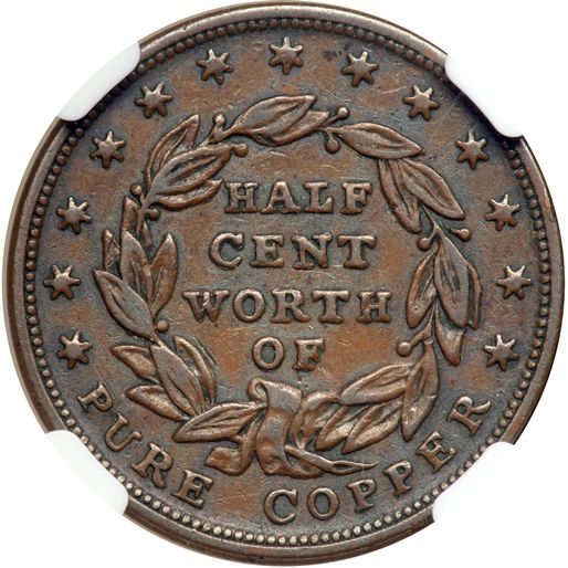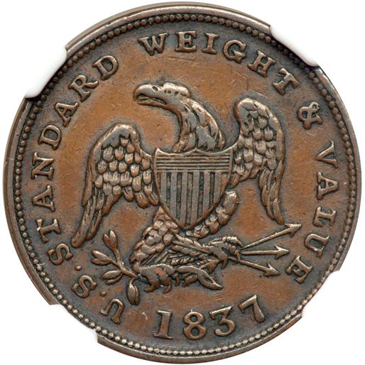 1837 Half Cent Token Low-49, Rulau HT-73 Rarity-2. NGC graded AU-53. Glossy medium brown and light chocolate fading to darker olive brown in protected areas. Smooth and attractive. A thin diagonal nick near the leaf under the W in WORTH is the only notable mark. The only half cent denomination in the Hard Times Token series, and it is often collected as part of the regular federal series of half cents. Our grade is VF35. The attribution is noted on the NGC label. See page 91 in the "Redbook."