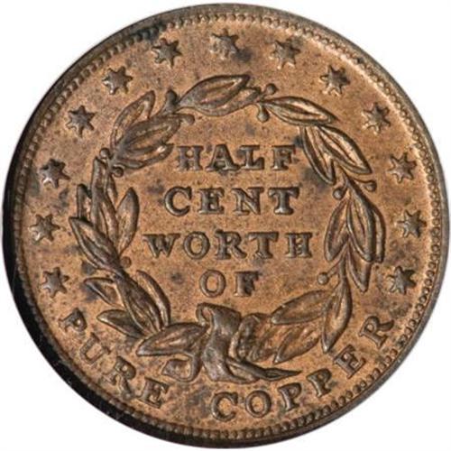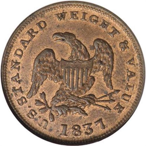 <B>1837 Half Cent of Copper, HT-73, MS62 Red and Brown NGC.</B></I> Low-49. The only half cent-sized Hard Times token issue, and often collected as part of the Federal half cent series since there are no 1837-dated half cents. It is listed as such on page 91 of the 2008 Guide Book. This boldly struck and mark-free example is more red than brown, and only the occasional subtle gray spot precludes a much finer grade.<BR><I>From The Madison Collection.</B></I><BR><BR><b>Shipping:</b> Coins & Currency (<a target="_blank" href="http://www.heritageauctions.com/common/shipping.php">view shipping information</a>)