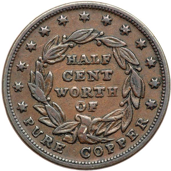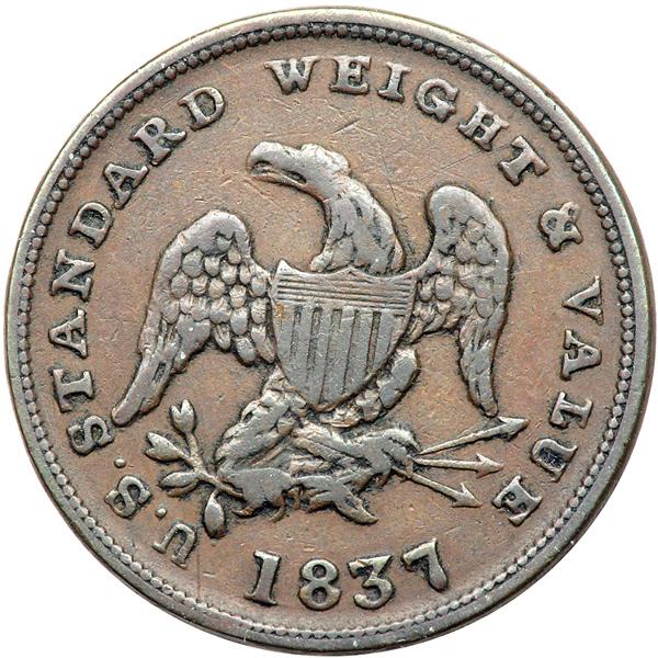1837 Hard Times Hoken Low-49 Rulau HT-73 R2. VF-20. Glossy medium brown and light chocolate. No defects, attractive for the grade. This is the only undisputed half cent token issued in the Hard Times series and they are frequently collected with the regular federal series of half cents since no half cents were minted in that year.