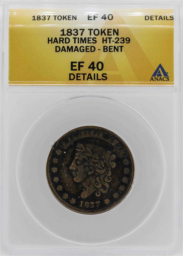 One 1837 Hard Times Not One Cent Token ANACS XF40 Details. ANACS Appraised.