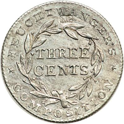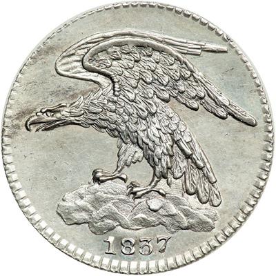 1837 Hard Times Token Low-118A Unlisted in Rulau R7+ (with counterstamp) Feuchtwanger's Metal. AU-58. Lustrous bright silvery gray, just starting to tone a darker steely gray on the reverse (denomination side). The obverse (eagle side) displays some faint hairlines in the fields, possibly from a light cleaning. No other defects. Just a hint of rub on the highest points from mint state, and the fields are slightly reflective on both sides. This "Defiant Eagle" version of Dr. Feuchtwanger's 3-Cent token is rare in its own right, but there are only 3 or 4 examples known with the JMP counterstamp, which is always carefully positioned under the WA at the top of the reverse. This stamp appears to be from a silversmith, but its origin has not been traced. The counterstamped version of Low-118 has appeared at auction only 8 times (including this listing), the most recent being in the Ford collection sale (Stack's 6/23/2004:214).