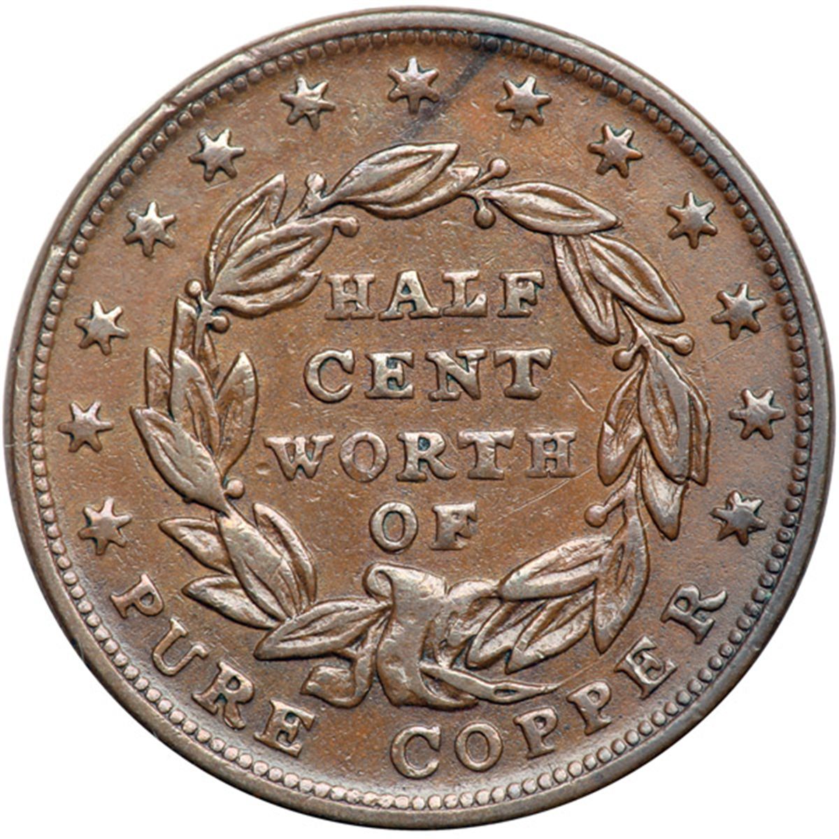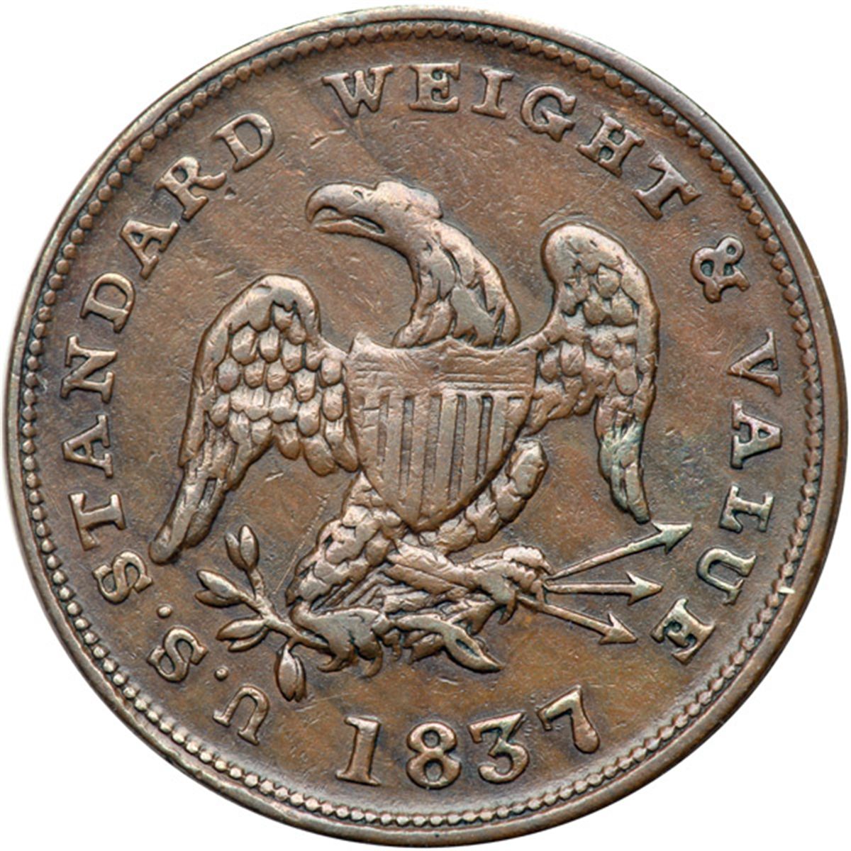 1837 Hard Times Token Low-49 Rulau HT-73 R2 VF35. Choice glossy medium brown and light chocolate. Smooth and very attractive for the grade with just a few trivial marks. A microscopic diagonal hairline scratch under the H in WORTH is the best identifying mark. This is the only half cent denomination in the Hard Times Token series and it is often collected as part of the regular Federal half cent series (see the 2012 "Redbook" page 91).