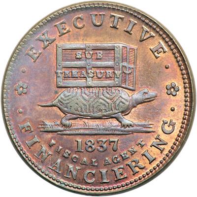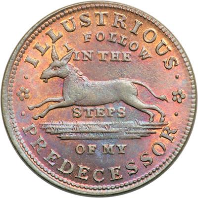 1837 Hard Times Token Rulau HT-34, Low-20 R1 . NGC graded MS-65 Red & Brown. Beautiful and highly lustrous mint red fading to bluish steel brown and chocolate, at least 25% of the mint color remaining on both sides. No defects and rather well struck for this variety with only trivial weakness in the centers. A premium example of the "Illustrious Predecessor" type. The attribution is noted on the NGC label.