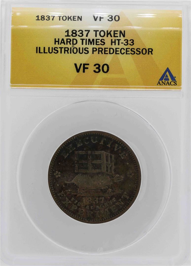 One 1837 Hard Times Turtle & Donkey Token ANACS VF30. ANACS Appraised.