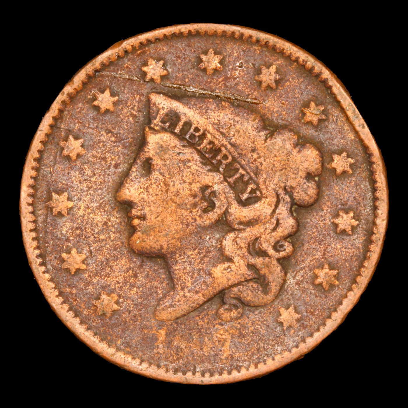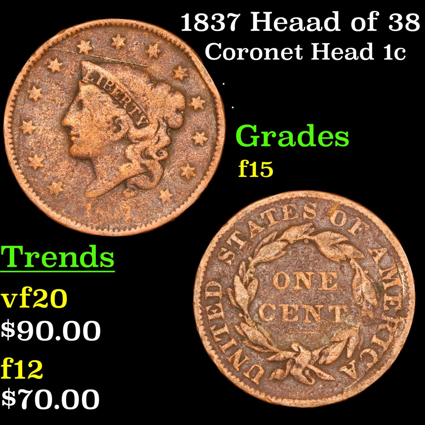 1837 Heaad of 38 Coronet Head Large Cent 1c Grades f+.