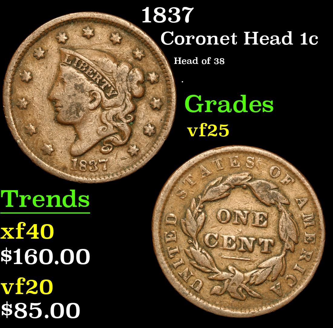 1837 Head of 38 . Coronet Head Large Cent 1c Grades vf+.