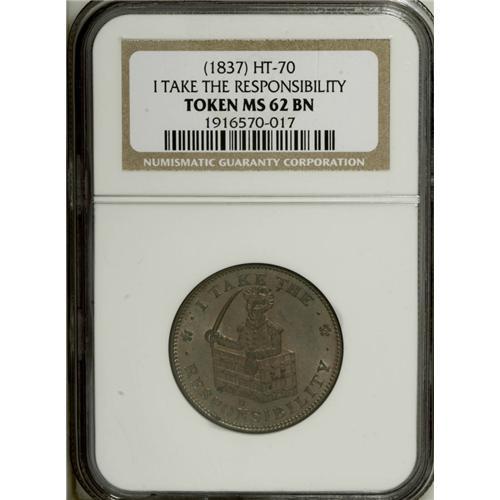 <B>(1837) I Take The Responsibility--Roman Firmness, Low-51, HT-70, MS62 Brown NGC.</B></I> A well-struck example with lustrous chocolate surfaces.<BR><BR><b>Shipping:</b> Coin/Currency (<a target="_blank" href="http://www.heritageauctions.com/common/shipping.php">view shipping information</a>)