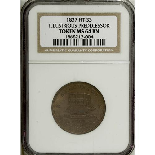 <B>1837 Illustrious Predecessor MS64 NGC.</B></I> HT-33. Copper. A decent token with dark-chocolate surfaces, with a hint of original red mint luster remaining. MS60 catalog value in the latest edition of <I>The Standard Catalog of United States Tokens 1700-1900</B></I> by Rulau is $250.<BR><BR><b>Shipping:</b> Coin/Currency (<a target="_blank" href="http://www.heritageauctions.com/common/shipping.php">view shipping information</a>)
