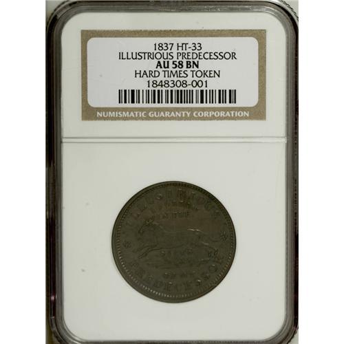 <B>1837 Illustrious Predecessor AU58 NGC.</B></I> HT-33, R.1. A nice chocolate-brown near-Uncirculated example of this relatively common Hard Times token.<BR><BR><b>Shipping:</b> Coin/Currency (<a target="_blank" href="http://www.heritageauctions.com/common/shipping.php">view shipping information</a>)