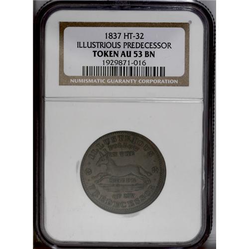 <B>1837 Illustrious Predecessor, Low-18, HT-32, DeWitt-CE-1838-2, R.1, AU53 NGC.</B></I> This chocolate-brown example has light wear on the donkey's flank, but glimpses of luster emerge from design recesses. Minor handling marks and a couple of subtle mahogany spots are typical of the grade.<BR><I>From The Troy Wiseman Collection.</B></I>