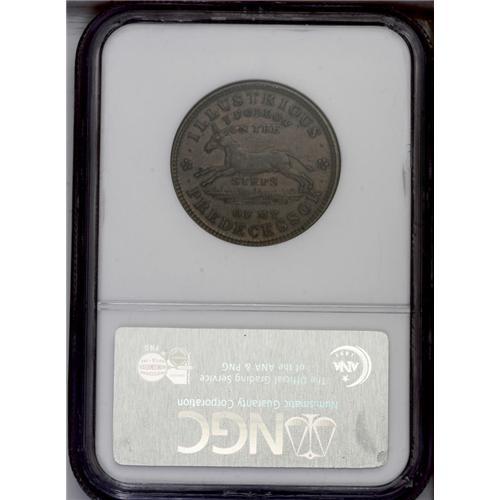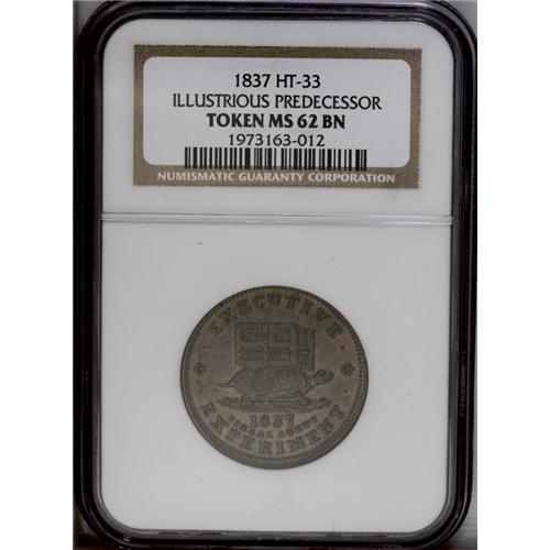 <B>1837 Illustrious Predecessor, Low-19, HT-33, DeWitt-CE-1838-3, MS62 Brown NGC.</B></I> A chocolate-brown example with slightly lighter tan toning about the legends and devices. A tiny dig is noted above the front hoof, and a few distributed thin marks are made inconspicuous by the toning. Only trivial carbon is detected.<BR><I>From The Troy Wiseman Collection.</B></I>