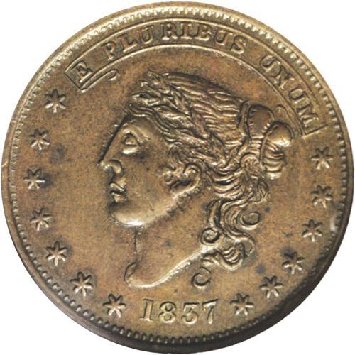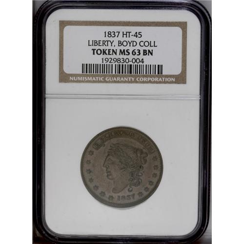 <B>1837 Liberty--Not One Cent, Low-30, HT-45, R.2, MS63 Brown NGC.</B></I> A beautiful cent token with smooth chocolate-brown fields and peripheral ice-blue tints. The exquisite definition in Liberty's hair is fully brought up, except on the hair bun, which has higher relief and also causes a hint of softness on the lowest right leaves within the wreath. The obverse of Low 30 was also used on one variety of the Daniel Webster ship varieties.<BR><I>Ex: F.C.C. Boyd; John J. Ford, Jr. Collection, Part IV (Stack's, 6/04), lot 83.</B></I>The Obverse of Low 30 was also used on one variety of the Daniel Webster ship varieties.<BR><I>From The Troy Wiseman Collection.</B></I>