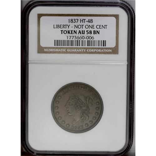 <B>1837 Liberty--Not One Cent, Low-33, HT-48, R.1, AU58 NGC.</B></I> Recutting on the N in UNUM helps identify this popular Hard Times token variety. Although slight friction on the cheekbone and ear denies a Mint State designation, this attractive piece exhibits substantial satin luster, and the unblemished surfaces are problem-free. Struck with medal turn.<BR><I>From The Troy Wiseman Collection.</B></I>