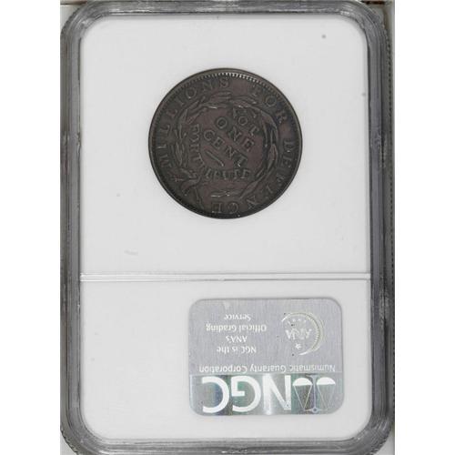 <B>1837 Liberty--Not One Cent, Low-36, HT-51, R.2, AU53 NGC.</B></I> This golden-brown example retains ample mint shimmer, although the leaves and hair show moderate wear. A faint vertical mark along the right border of the cheek is appropriate for the grade. The dies are rotated clockwise about 40 degrees.<BR><I>From The Troy Wiseman Collection.</B></I>