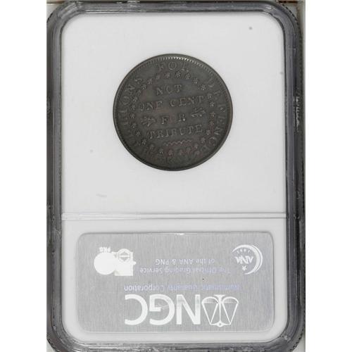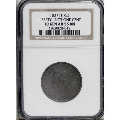 <B>1837 Liberty--Not One Cent, Low-39, HT-52, R.1, AU55 NGC.</B></I> Low-39 is identified by a level TRIBUTE, which is curved on the other E PLURIBUS UNUM/NOT ONE CENT Hard Times varieties. This medium-brown piece was struck from slightly misaligned dies, which causes a hint of softness on PLURIBUS and on the lower reverse sprig. Moderate obverse verdigris is detected beneath a glass.<BR><I>From The Troy Wiseman Collection.</B></I>