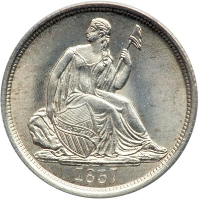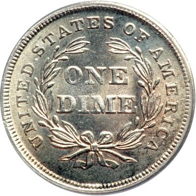 1837 Liberty Seated Dime. Large date. Altered surfaces but still lustrous and attractive for the right buyer. This is Gobrecht's acclaimed design of Liberty seated surrounded by a plain background. Our grade is sharpness of MS63 (PCGS # 4561) .