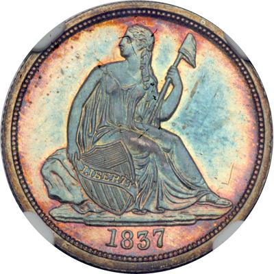 1837 Liberty Seated Dime. NGC graded Proof 65. Wonderful blue and golden toing. Very Rare. Greer-102. "All Proofs of this first-year issue are of the Large Date variety," observes the Heritage cataloger. The diagnostic die scratch on the reverse from the rim above the first T in STATES is visible on this coin under a loupe, as well as a faint die scratch through the ES and O in STATES OF. The later feature is also diagnostic of this issue. Writing in 1977, Breen states that perhaps 20 examples of this rare first-year Proof are extant, some of which are impaired. In his 1988 Encyclopedia, however, the author states that "30+" Proof 1837 No Stars Dimes are extant. Regardless of which, if either, of these estimates is accurate, there is no doubt that this Proof issue is one of the premier rarities in the Seated Dime series.