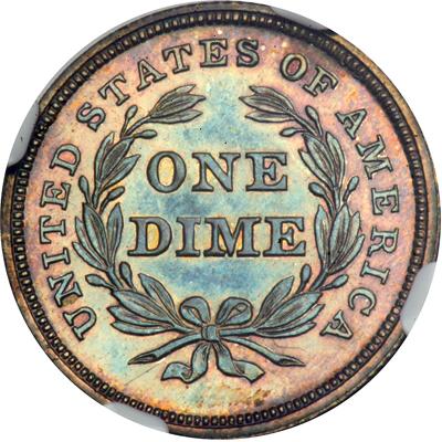 An unquestionably desirable rarity for a first-year Proof type collection, this is a fully original Gem whose deep, rich, charcoal-gray toning explodes into vibrant rainbow colored overtones. The fields shimmer as the viewer rotates the coin beneath a strong light, making it easy to see that the devices are extraordinarily well formed. "The quintessential representative of Christian Gobrecht's original conception of the Seated Liberty Dime." In a new 4 pronged NGC holder. Pop 1; 3 finer; 1 in 66; 2 in 67.