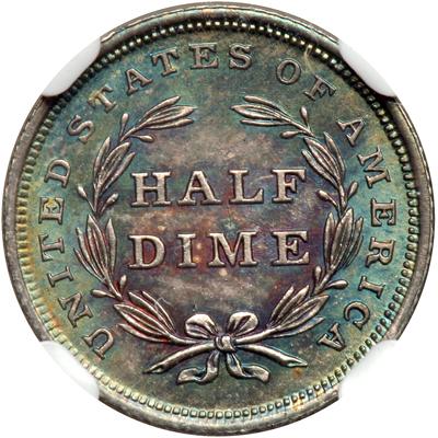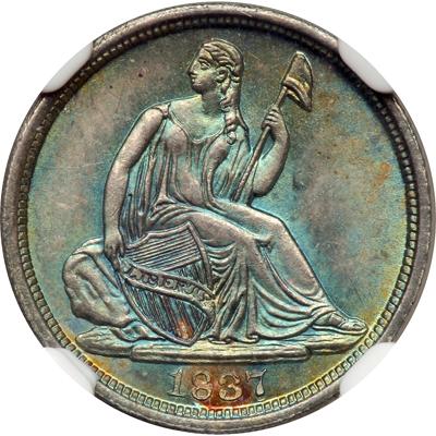1837 Liberty Seated Half Dime. NGC graded MS-66. Star. Wonderful green, blue and golden toning. Pop 1; 15 finer. In a new 4 pronged NGC holder.