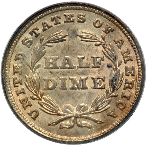 1837 Liberty Seated Half Dime. No stars, large date. PCGS graded MS-64 CAC Approved. Well struck with delicate golden toning. Lustrous and showing all the finer details. In an old green label holder. The creator of this coin, Christian Gobrecht, must have been full of pride to see his first provisional coin drawings rendered into these beautiful silver Half Dimes and Dimes of 1837-1840. By using a blend of diaphanous dress for Liberty and no stars, combined with a leaning shield and curving LIBERTY ribbon, he succeeded better than any predecessor mint engravers in portray the spirit of America's great calling. This lovely half dime nicely liberates that feeling. But beauty, like success, is fleeting; in 1840, the mint's officialdom in their powerful wisdom decided Gobrecht's vision wasn't quite clear enough. They commissioned Robert Ball Hughes to "sanitize" it. Imagine Gobrecht's embarrassment! He must have pinched his nose in horror at the mauling his gentle, delicate design received on post-1840 coinage. Luckily, there are still a few pleasing MS64 examples like the present coin surviving to remind us of Gobrecht's proficiency, his genius, his vision. Pop 140; 102 finer (PCGS # 4311) .