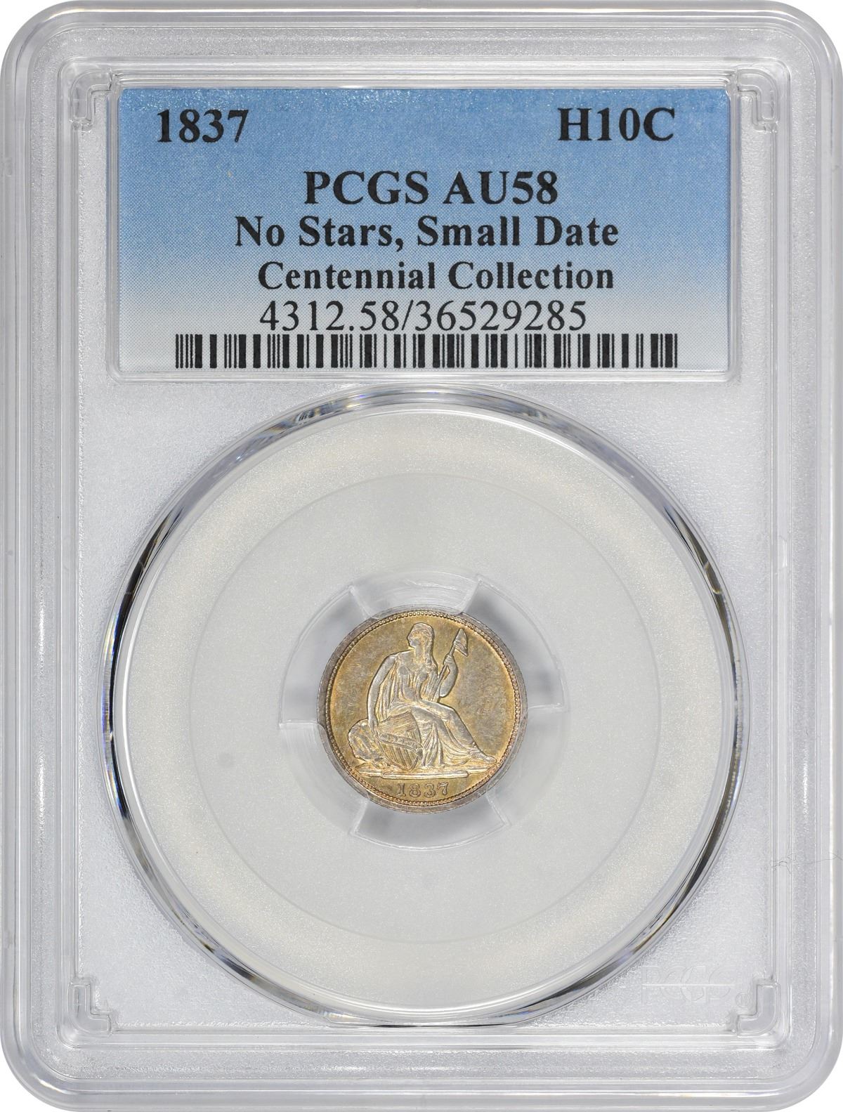 The present lustrous No Stars half dime is what the AU-58 grade is all about; it’s sharply struck, boldly lustrous, and offers that first glance inclination of a finer grade. Lively peach-gold iridescence engages both sides. Struck from a rotated reverse die, top of wreath points to 1 o’clock instead of the customary noon position.