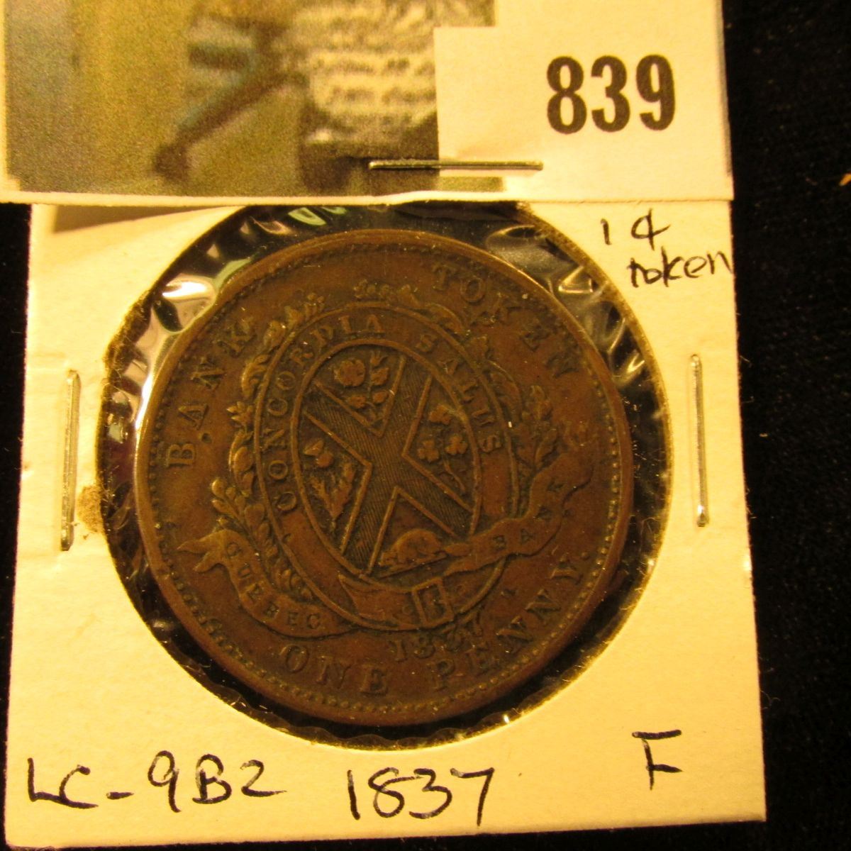 1837 Lower Canada One Cent token, Fine, Charlton LC9-B2.