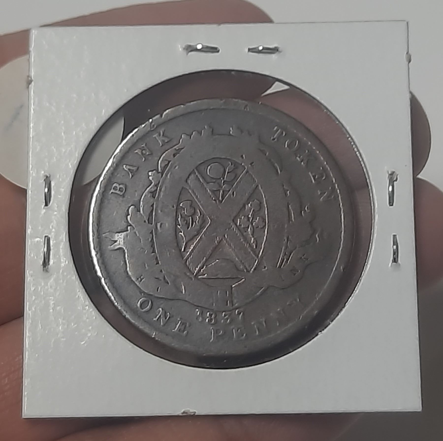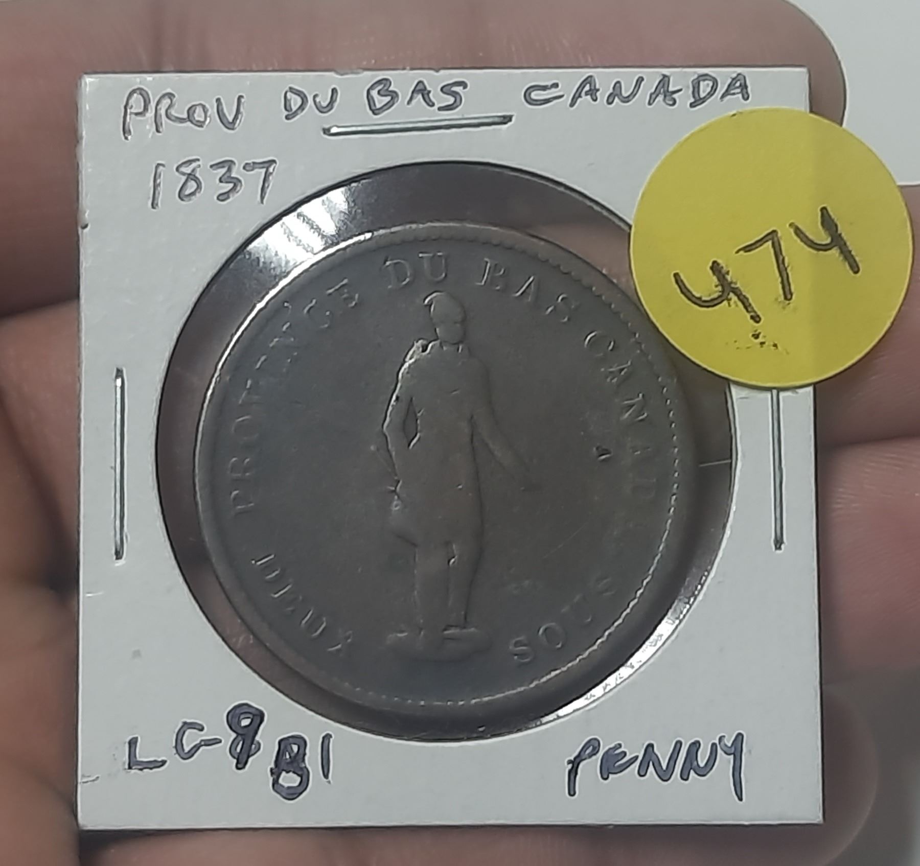 1837 Lower Canada One Penny Bank Token. Quebec Bank on ribbon. LC-9B1 with Period after Canada. Good.