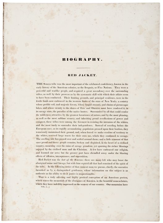 This historic print is also accompanied by the original, mated large folio, 13-page biography of Red Jacket, also from McKenney and Hall’s “History of the Indian Tribes of North America...” 20” x 14.5”, which is Very Fine, with scattered foxing. A footnote mentions that Red Jacket normally dressed only in his tribal costume, but made an exception when he sat for the painting by C.B. King, from which this print is made. (2 items) .