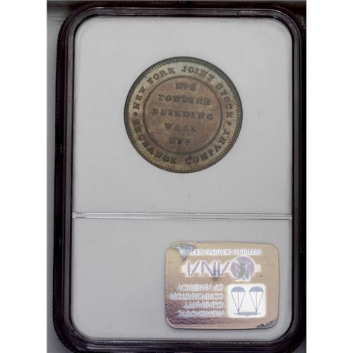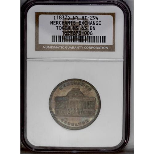 <B>(1837) Merchants Exchange, Low-98, HT-294, R.1, New York City, NY, MS63 Brown NGC.</B></I> Copper. Impressive cartwheel luster endows this chestnut-brown and aqua-gold example. A few wispy hairlines and a steel-gray spot are noted left of the dome, and the peripheries have a couple of thin marks.