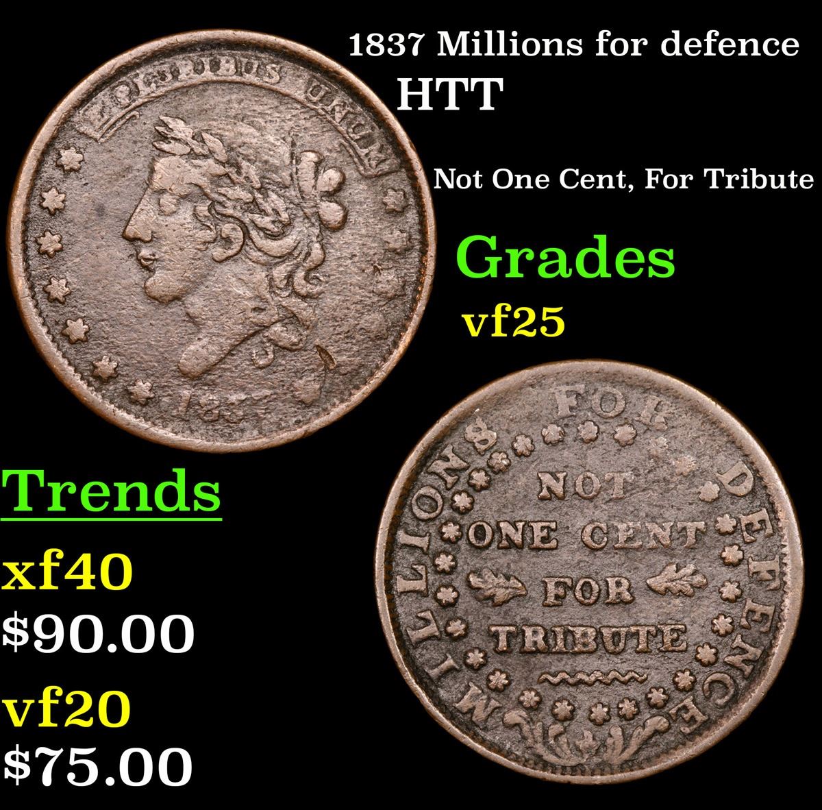 1837 Millions for defence Not One Cent, For Tribute . Hard Times Token 1c Grades vf+.