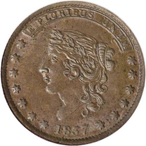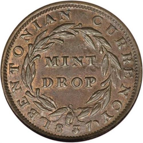 <B>1837 Mint Drop, HT-62, MS62 Brown NGC.</B></I> Low-38. A lovely chocolate-brown representative with glossy, mildly reflective fields. Glimpses of mint red accompany portions of the design. A few shallow strike-throughs near the T in MINT and behind the portrait are of mint origin. Remarkably void of marks, and worthy of bidder attention.<BR><I>From The Madison Collection.</B></I><BR><BR><b>Shipping:</b> Coins & Currency (<a target="_blank" href="http://www.heritageauctions.com/common/shipping.php">view shipping information</a>)