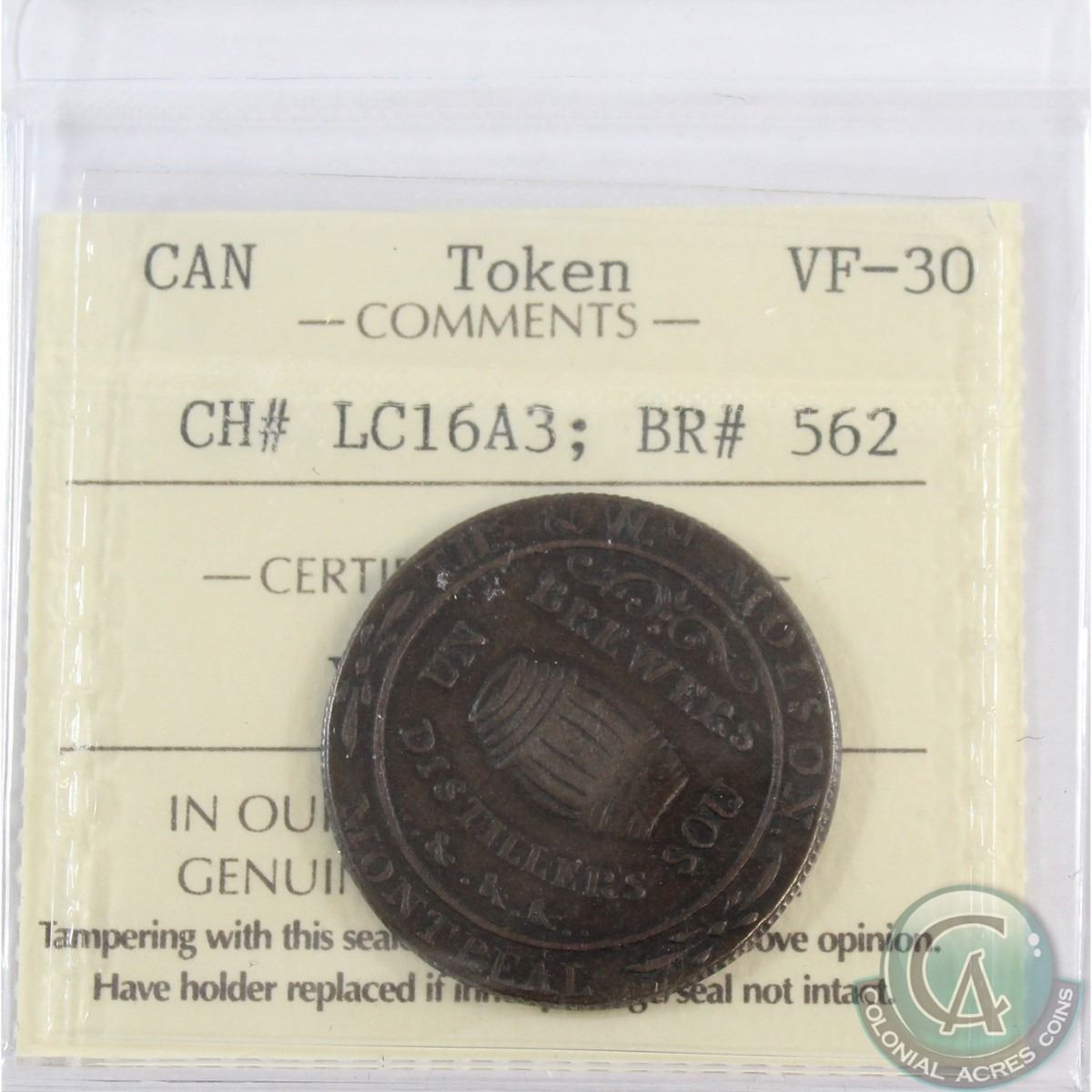 Cash Paid for All Sorts of Grain 1837 - THS & WM Molson Montreal Brewers Distillers (Un Sou)' Breton 562. A Rare and desirable token, this is the Thin Flan, Reeded variety (LC-16A3) ICCS Certified VF-30 A very solid grade for the details on this token.