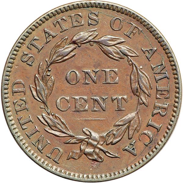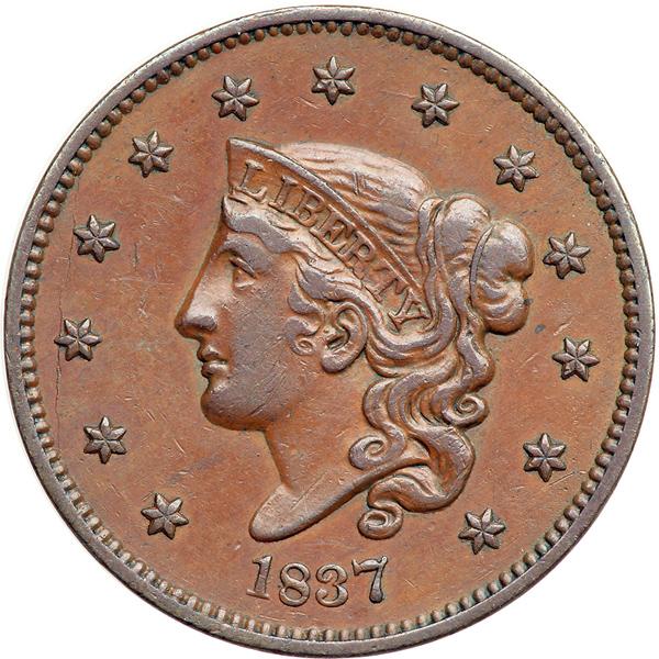 1837 N-15 R3. VF-35. Five points sharper but there are fine, light scratches covering the cheek. The marks are not visible without the aid of a glass, and this cent offers outstanding eye appeal in spite of the minor defects. Very attractive frosty medium brown. The best identifying mark on this piece is a shallow planchet flake down from the bottom edge of the ribbon loop, as struck. EDS. A fine vertical die crack reaches from the dentils at star 2 through the outer points of stars 3 & 4 to the dentils at star 5, but the usually-seen fine vertical crack up from the upper point of star 4 has not formed. A single radial die crack reaches from the left top of the R in AMERICA to the dentils, and the additional radial cracks to the dentils from the M & C have not formed. May come in an earlier die state, but your cataloger has not seen one. DWH #3421.