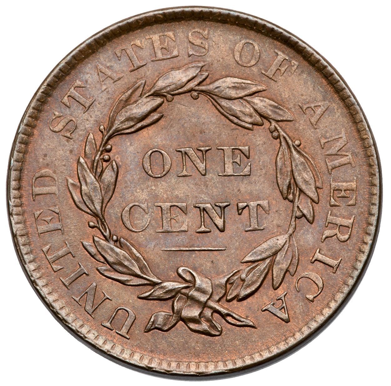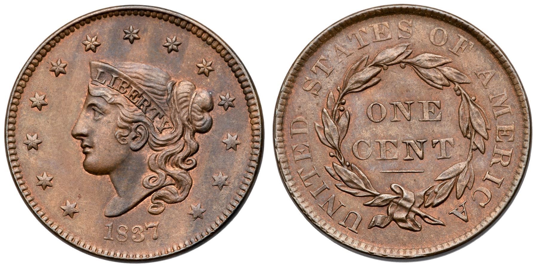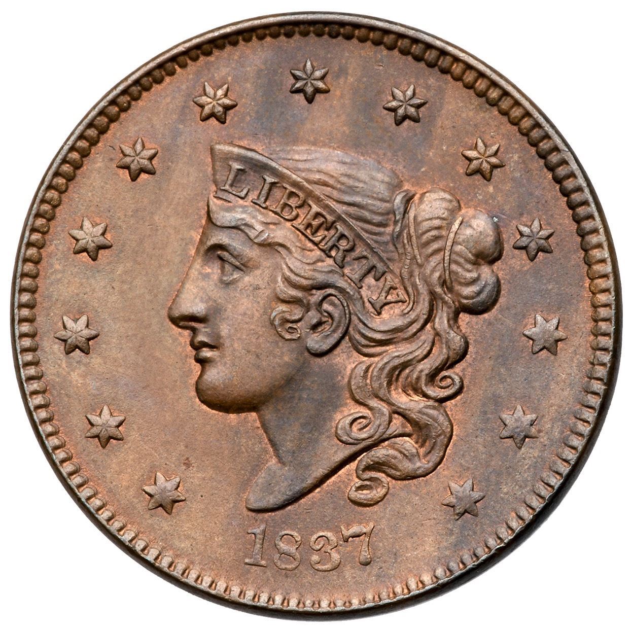 1837 N-16 R3+ Plain Hair Cord, Medium Letters MS60+Lustrous light steel brown with bluish steel overtones and generous traces of faded mint red in protected areas. Satiny and choice if not for some parallel streaks of darker steel toning on the right side of the obverse. The only contact mark is a hidden in the hair below the B in LIBERTY. MDS.Certificate Number: Pedigree: Ex Denis W. Loring 3/1980-John J. Nicholas, Superior 2/2/1992:603-Wesley A. Rasmussen, Heritage Auctions 1/13/2005:3690 (as NGC MS65BN, EAC MS63)-Chris McCawley 9/16/2013-Terry S. Denman Collection