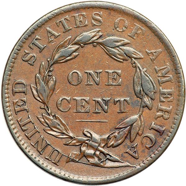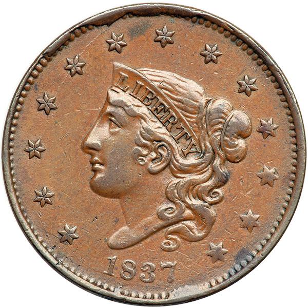 1837 N-17 R4 VF35. VF-35. Glossy light to medium reddish brown with slightly darker steel brown toning on the highpoints. Smooth, defect-free surfaces. A small swipe of darker olive toning between stars 6 & 7 and another at the dentils right of star 13 offer the best identifying marks. LDS. The cud break right of the date involves 6 dentils and extends well into the field reaching from under the 7 to below the left point of star 13. An additional clear die crack extends from the tip of the wreath ribbon down to the rim below. Removed from an NGC slab graded AU55BN (NGC label included, and it shows the attribution and Reiver provenance). DWH #2953.