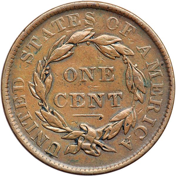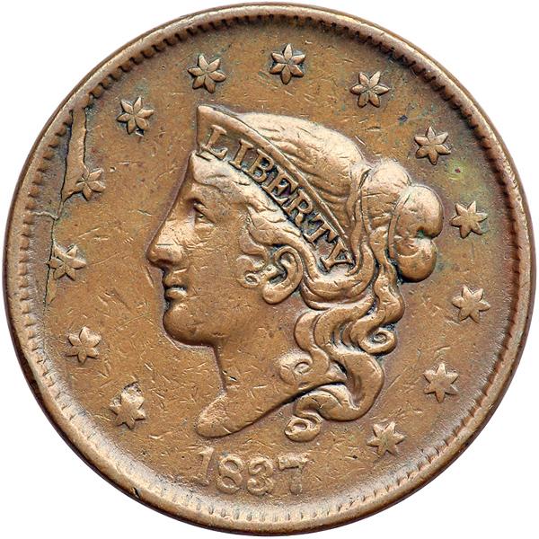 1837 N-2 R2 F15. Fine-15. Five points sharper but lightly cleaned, now retoned glossy medium brown. A pinprick at the right end of the line under CENT is the notable mark. LDS (but not the latest) with the thin internal cud break up from star 4 fully raised, and the cud down from star 3 strong but still retained. This is the finest known example with the cud up from star 4 fully raised; the other examples have this cud retained with the left points of star 4 still showing in the cud. DWH #1615.