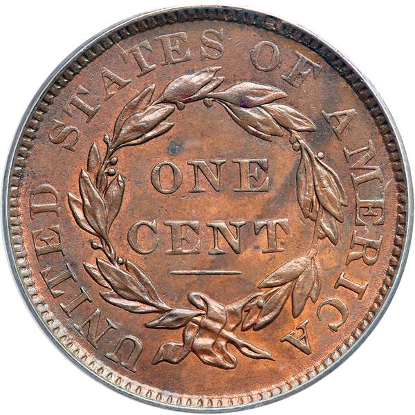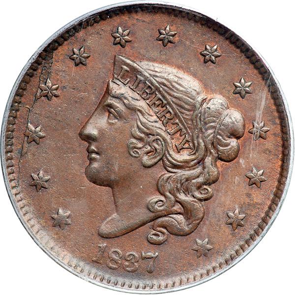 1837 N-2 R2 PCGS graded MS64 Brown. PCGS graded MS-64 Brown. Glossy steel and light chocolate with faded mint color showing on both sides, especially on the reverse. A spot of darker toning over the O in ONE and a swipe of similar toning from right of the F in OF down to the N in CENT are the only marks visible without a glass. Frosty mint luster is peeking through the glossy toning in the fields and protected areas. M-LDS. The rising retained cud up from star 4 is similar to the one found on the preceding example, and another smaller one has developed down from the left side of star 3. Called MS60+ and tied for CC#1 in the Bland census. Noyes says MS60 net AU55 and tied for CC#3, his photo #21918. Our grade is AU58. Pop 2; none finer. Only 3 graded at PCGS for the variety. DWH #3542.