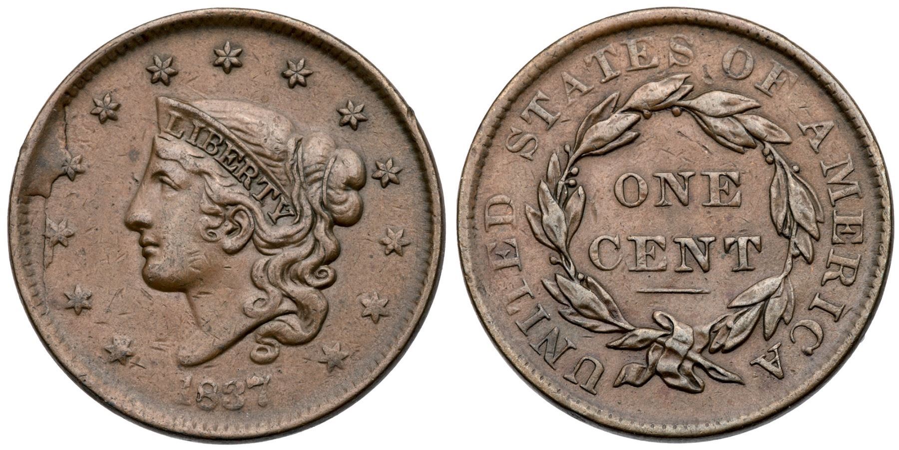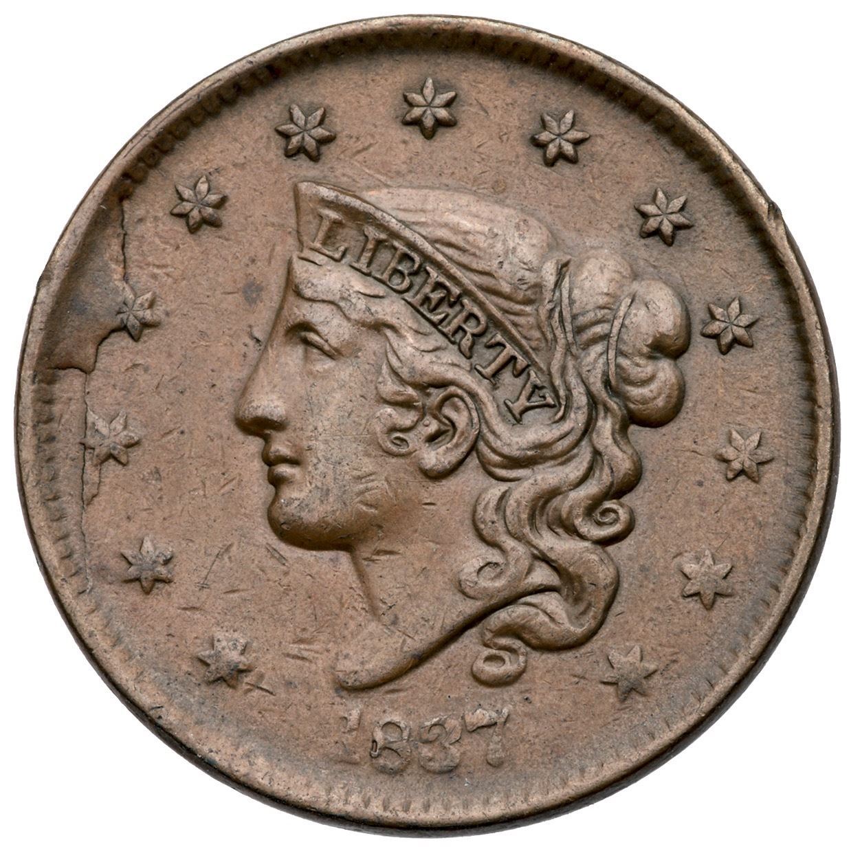 1837 N-2 R2 Plain Hair Cord, Medium Letters VF30Glossy medium brown blending to chocolate in protected areas. Smooth with small contact marks scattered over both sides, mostly in the field before the portrait. A tiny rim nick left of star 4 and a small pinprick in the field close before the eye may help identify this cent. Extremely rare TDS, die state g, with a large cud break connecting star 4 to the rim. Graded VF35 net VF25 and second finest of the terminal state in the Noyes census, his photo #59621. Noyes lists only 3 examples of the terminal die state in his census, although there may be a couple more out there somewhere. A great die state for the serious collector of this series.Certificate Number: Pedigree: Ex George Ramont 8/9/1977-Jules Reiver, Heritage Auctions 1/24/2006:20066-Daniel W. Holmes, Jr. 3/2006-Chris McCawley 4/26/2013-Terry S. Denman Collection