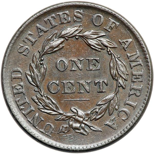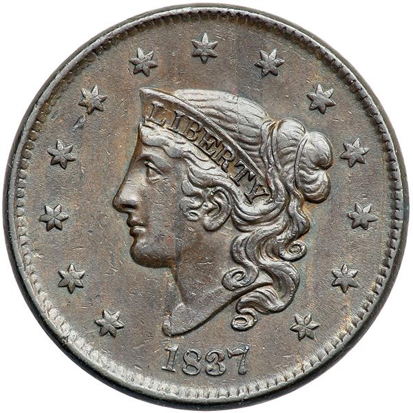 1837 N-3 R1 EF45. EF-45. Five points sharper with too many microscopic contact marks plus some very faint vertical laminations on the obverse, strongest from star 10 to star 12. Frosty steel brown and chocolate, the obverse delicately woodgrained in a vertical pattern that follows the laminations. MDS. The fields are covered with fine die flowlines and the die crack around the reverse legend is stronger. The dentils are weakening, especially on the upper half of the reverse, but most remain clear. DWH #1617.