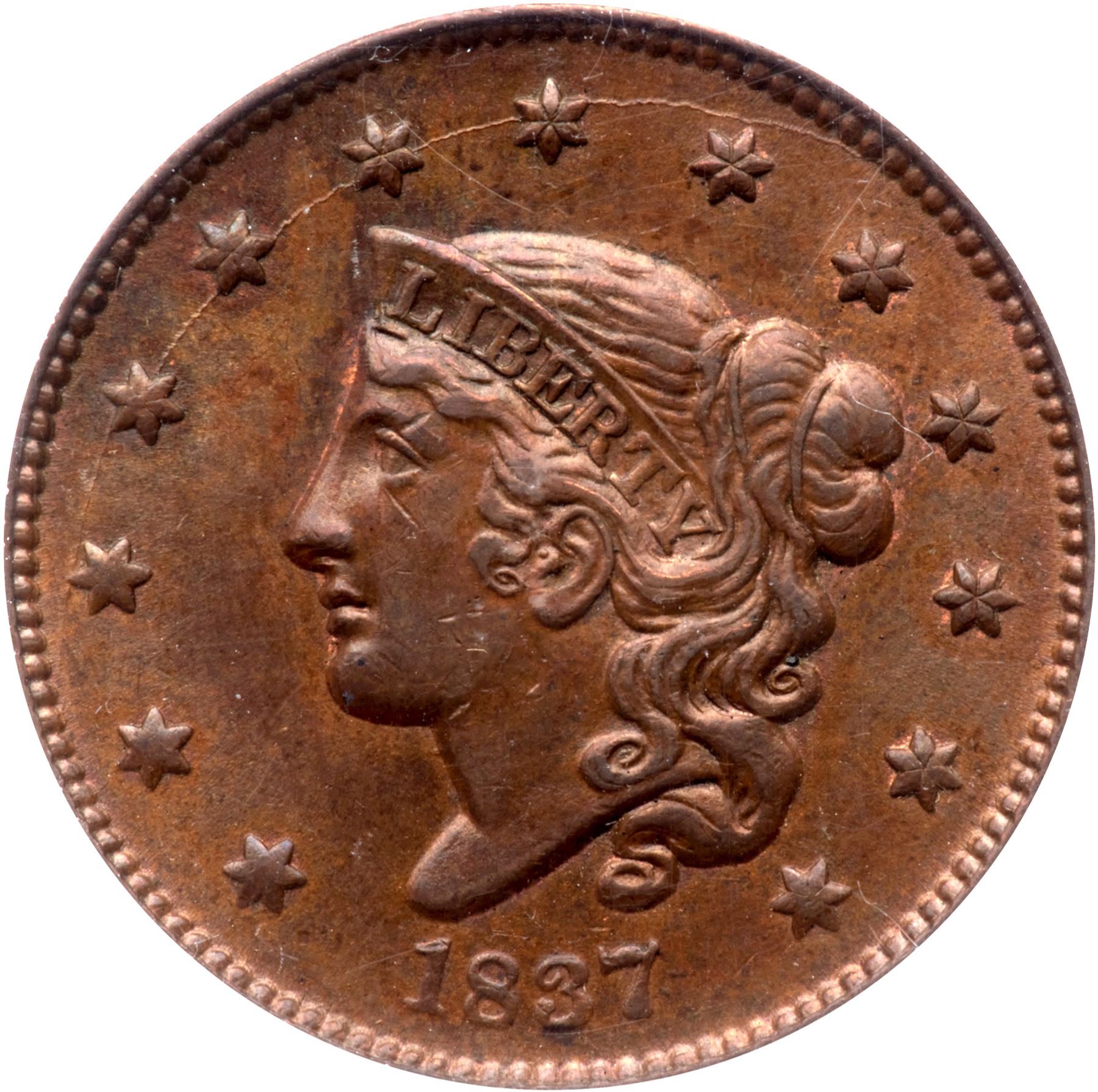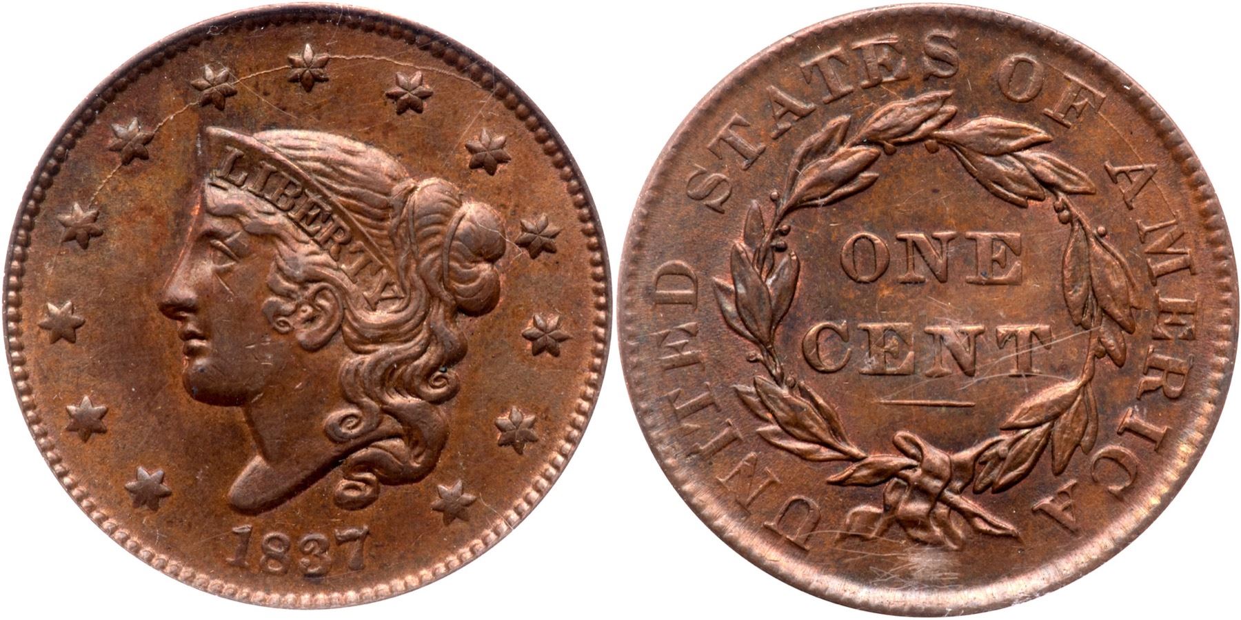 Olive tan and gold with traces of mint red. There is a tiny nick above Liberty’s eye. Hard to find fault with this pretty coin.