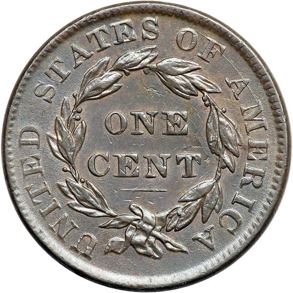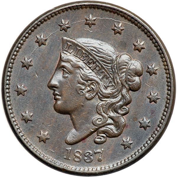1837 N-4 R2 EF45. EF-45. Frosty bluish steel brown with lighter steel brown in protected areas. The notable mark is a thin planchet lamination that connects the right sides of the E in ONE and T in CENT. MDS. The obverse fields are covered with fine die flowlines, the left top of the I in UNITED is weak but visible, and the reverse dentils are weak but complete. DWH #1620.