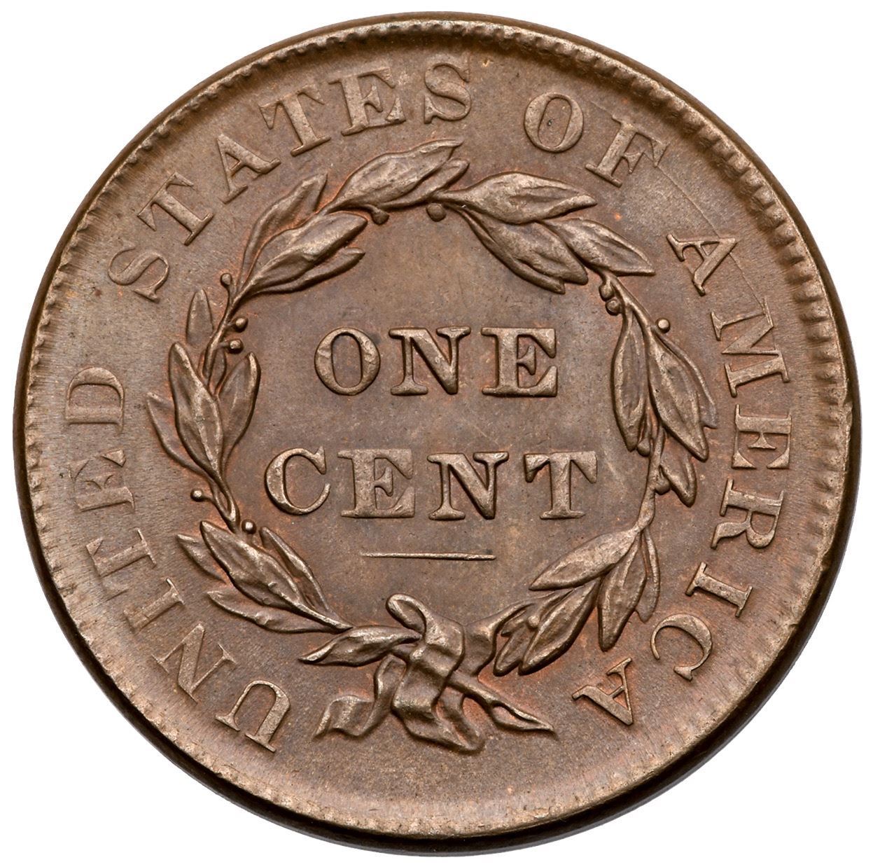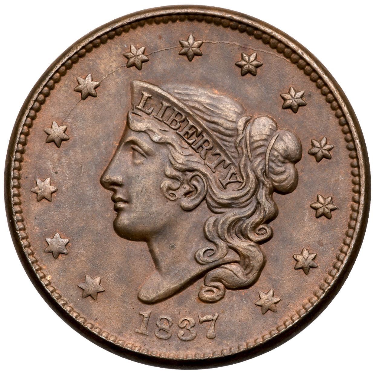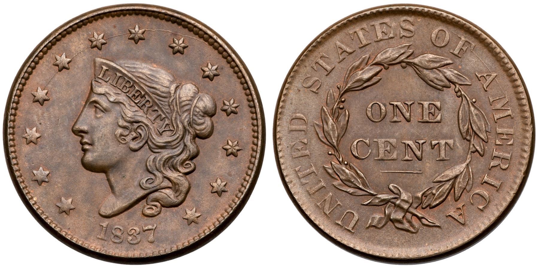 1837 N-4 R2 Plain Hair Cord, Medium Letters MS60Lustrous light bluish steel brown with faded mint color peeking through in protected areas on both sides. The obverse is very delicately mottled with puffs of slightly darker steel toning. The surfaces are satiny and this cent has very nice eye appeal. Essentially flawless. A very tiny vertical nick in the field before the tip of the nose and a tick on the left side of the O in ONE are the best identifying marks, and they are barely visible with a glass. E-MDS with very fine radial flowlines in the fields, strongest near the dentils. Noyes photo #20850. Our grade is MS60.Certificate Number: Pedigree: Ex 1983 EAC Convention bourse-R. E. "Ted" Naftzger, Jr.-Naftzger Estate, McCawley & Grellman Auctions/Goldbergs 2/1/2009:367 (PCGS MS65BN)-Thomas D. Reynolds-Terry S. Denman Collection