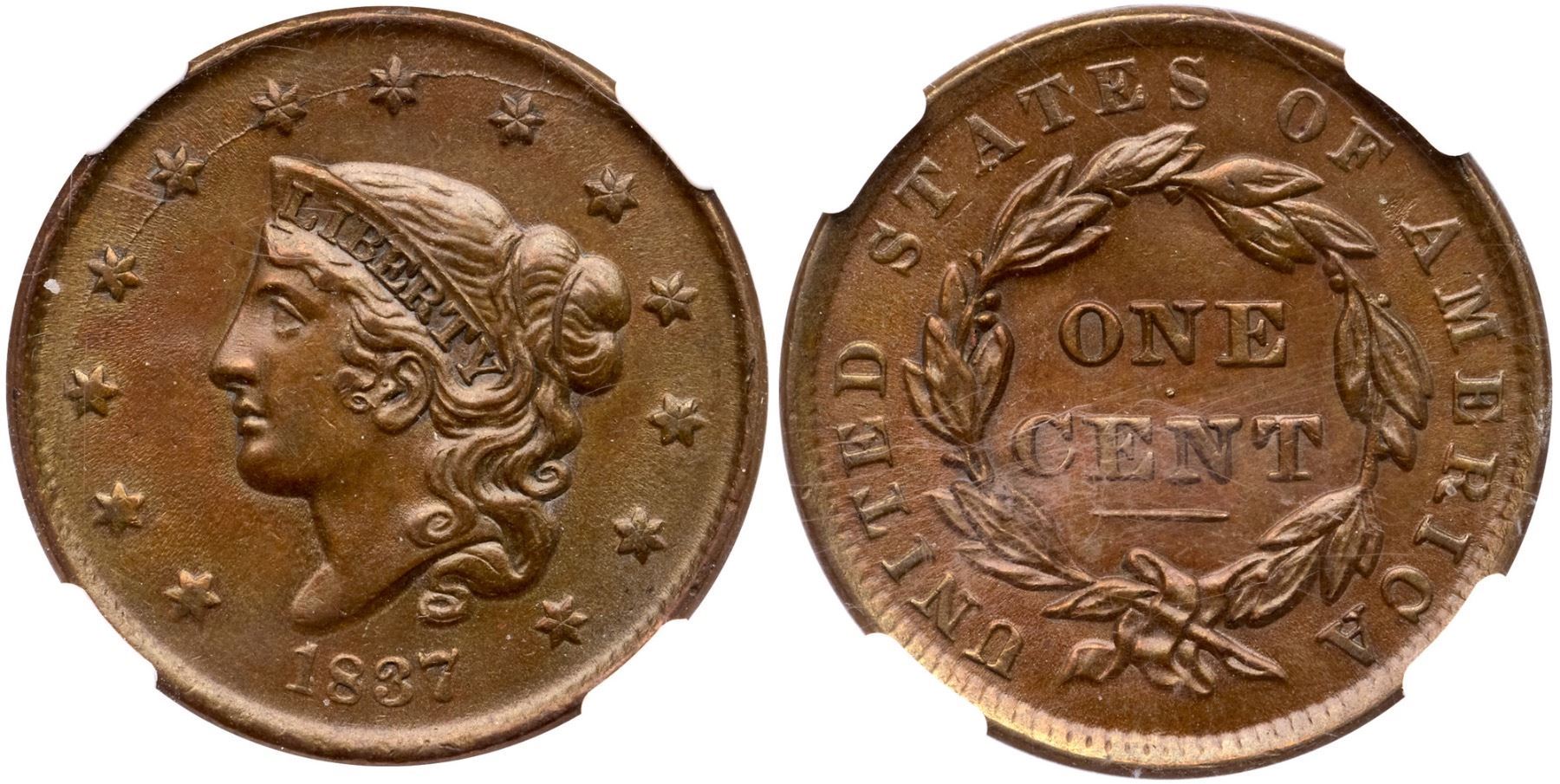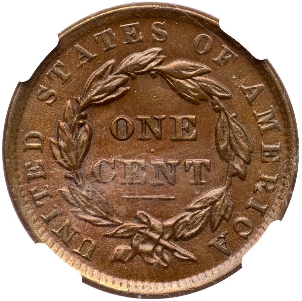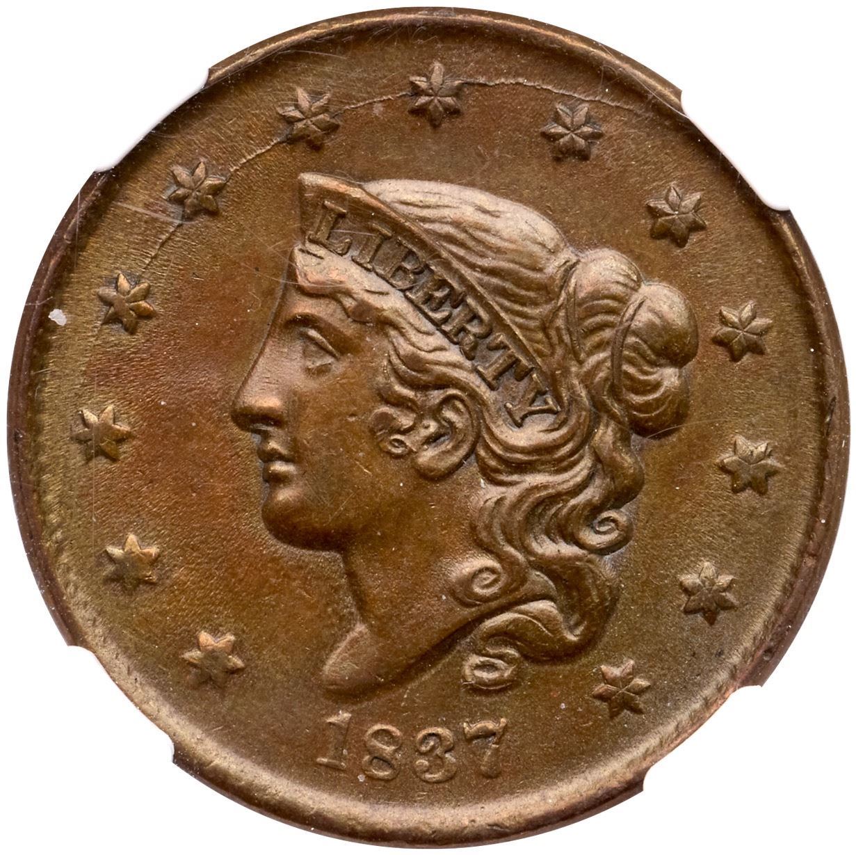 1837 N-5 R-2 Small Letters NGC MS62BNAttractive golden tan and light olive with traces of very faded mint color on the reverse. Free of notable marks, choice with great eye appeal. Small Letters, the most difficult of three Red Book varieties of this date. Our grade is AU50+. The Jack Conour provenance is noted on the label.Certificate Number: 2598844-020Pedigree: Ex; Jack Conour, Shawn Yancey FPL 2013 - EAC Sale 2019 lot 286 - Doug Durasoff